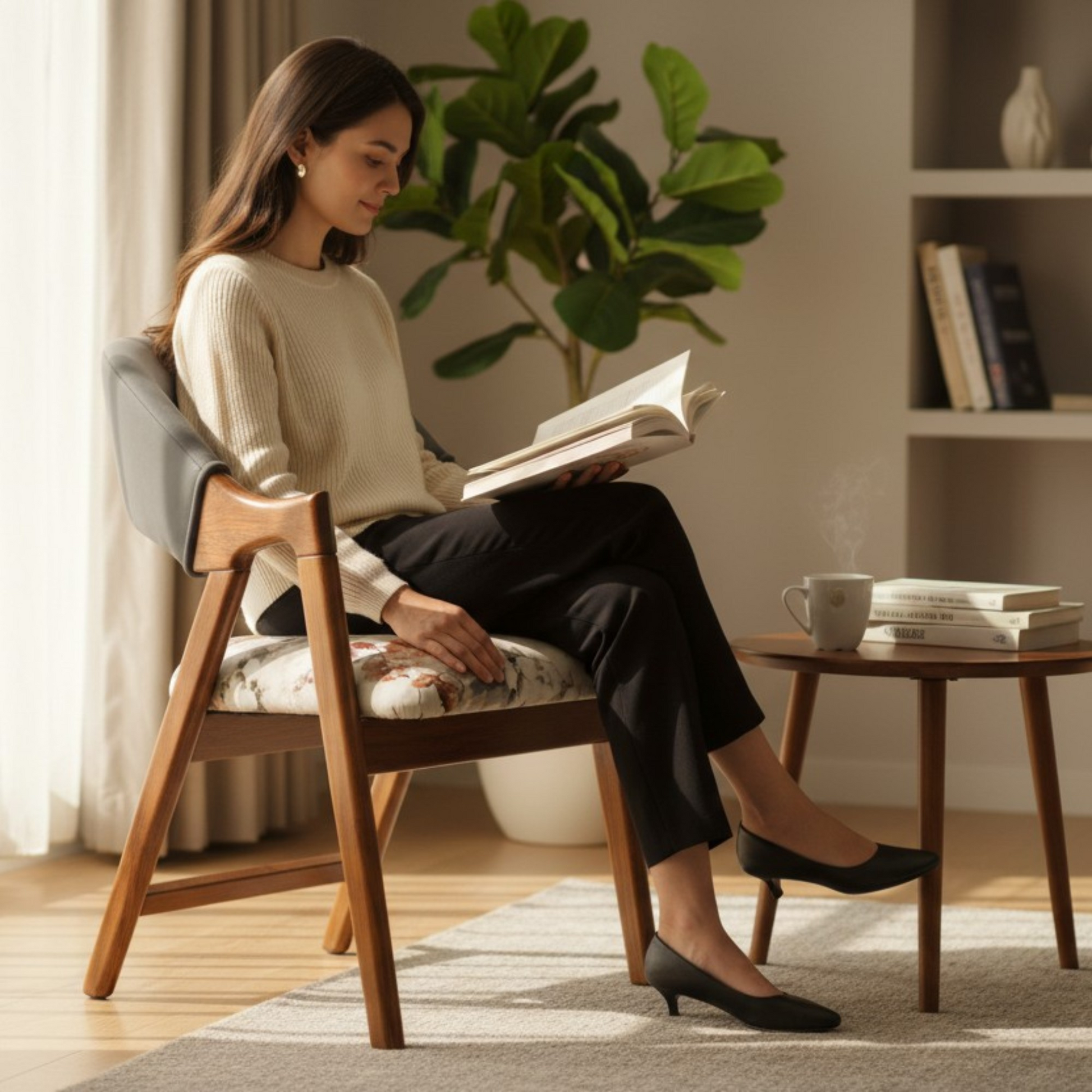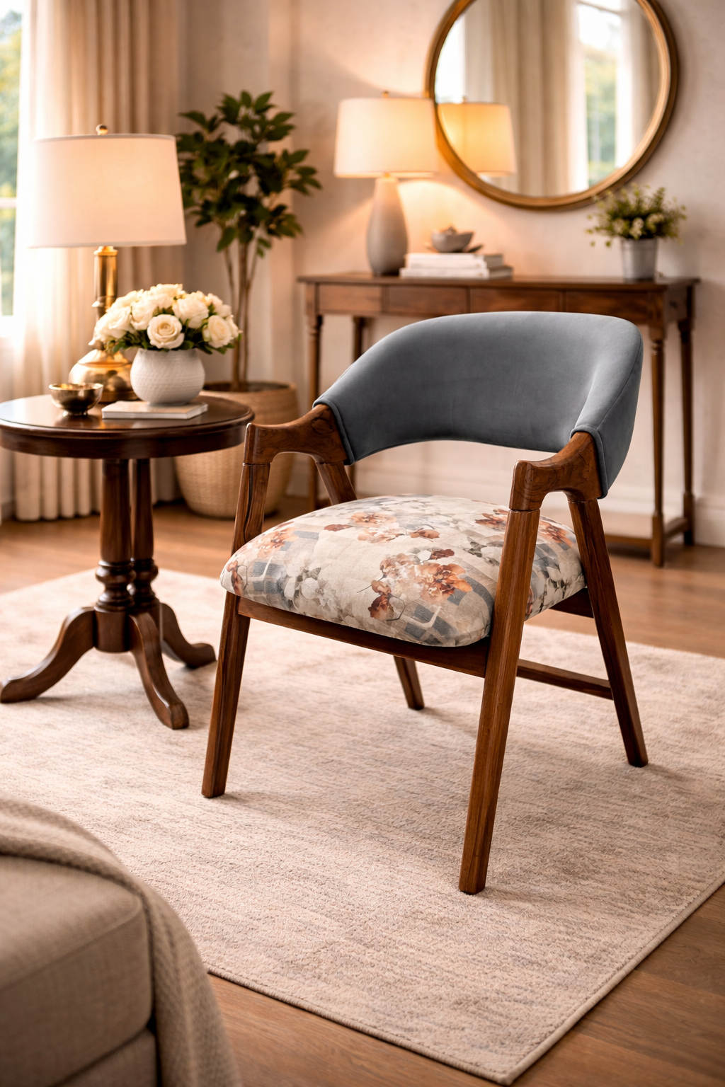 Elegant Teak Wood Living Room Chair with Floral Fabric Upholstery