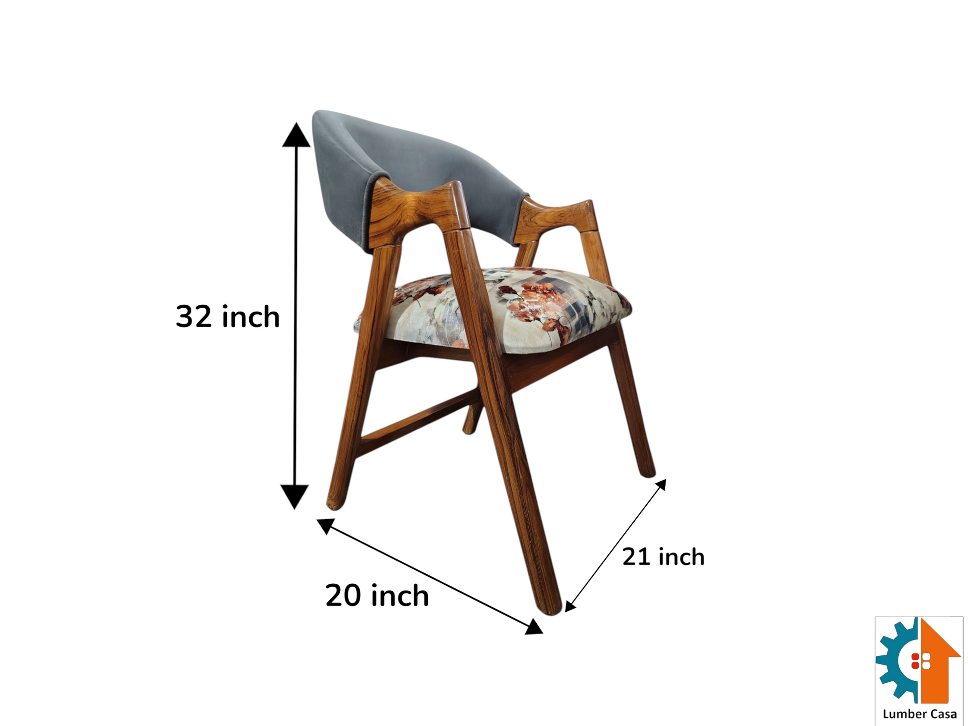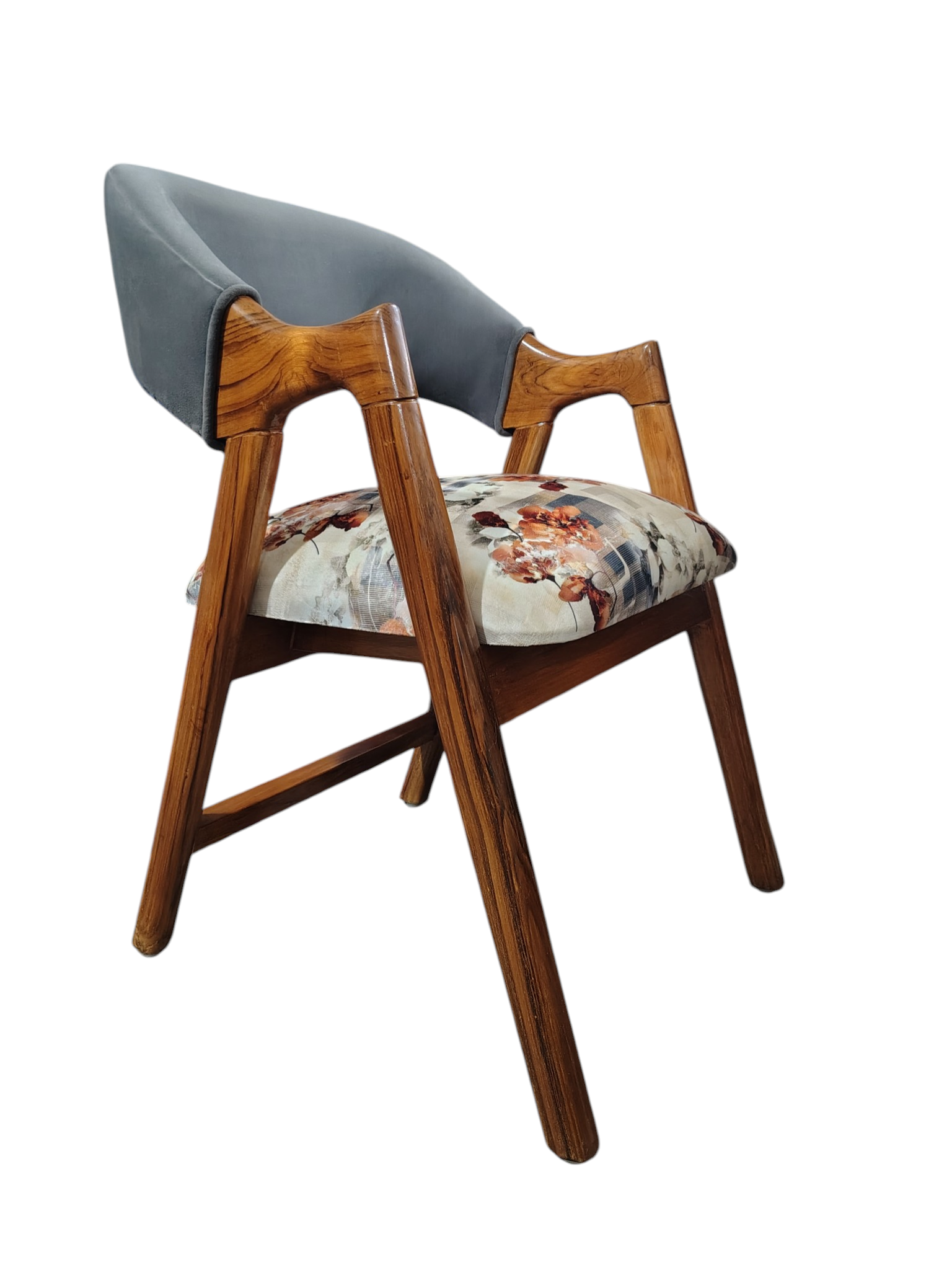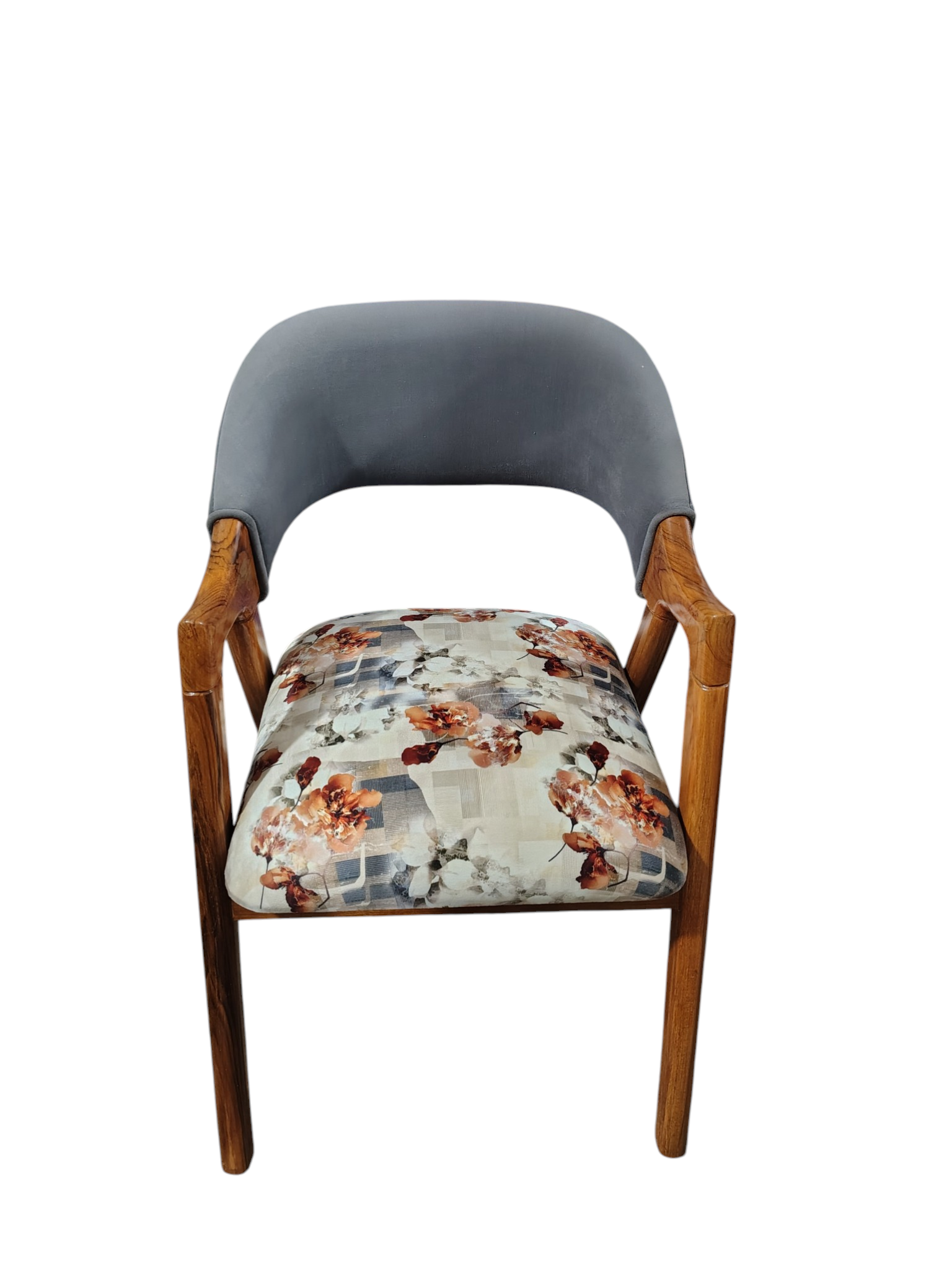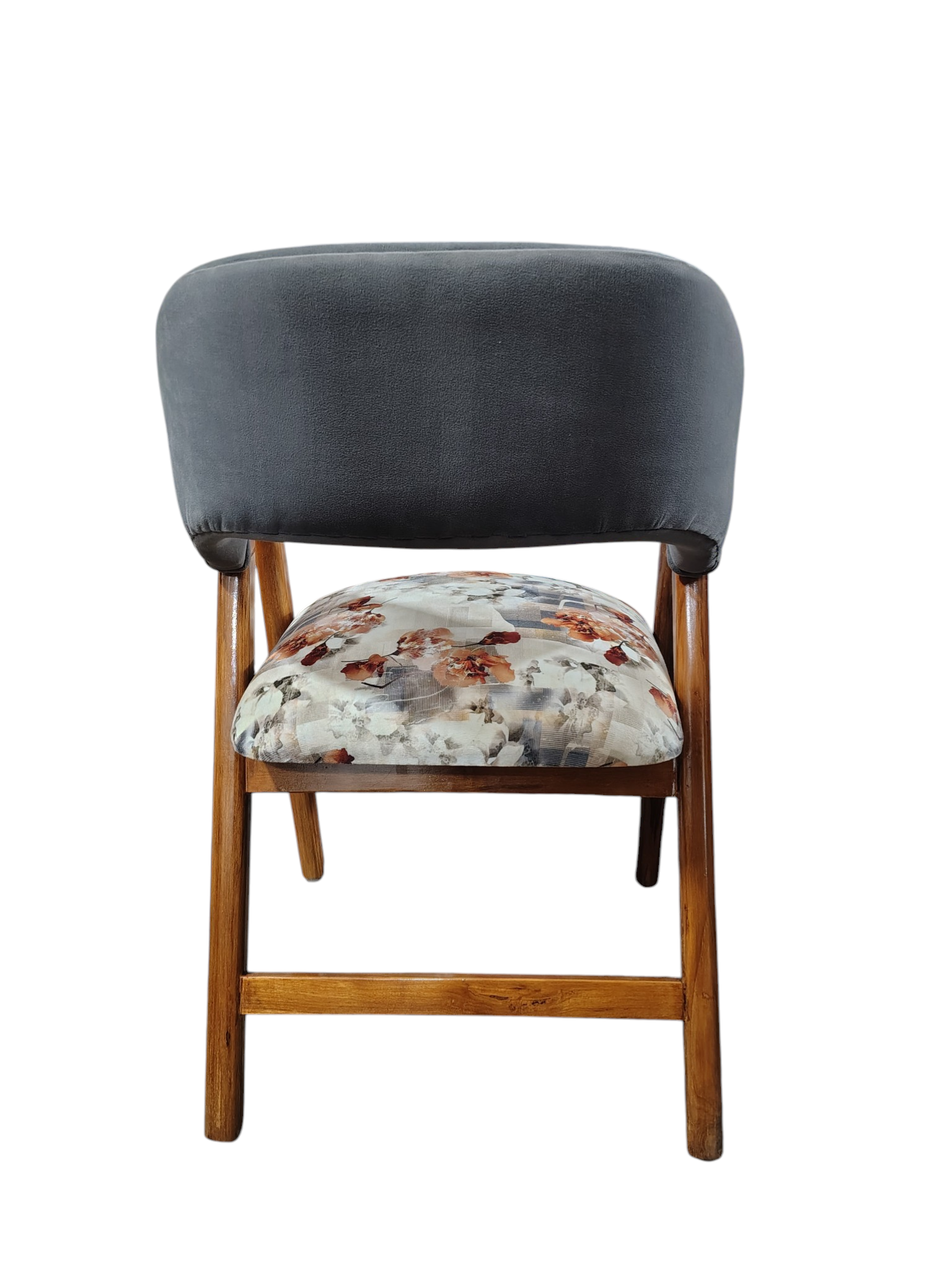 This stylish piece combines the durability of Teak wood with the comfort of high-density foam, featuring a unique dual-tone design with a plush grey backrest and a beautiful floral seat.