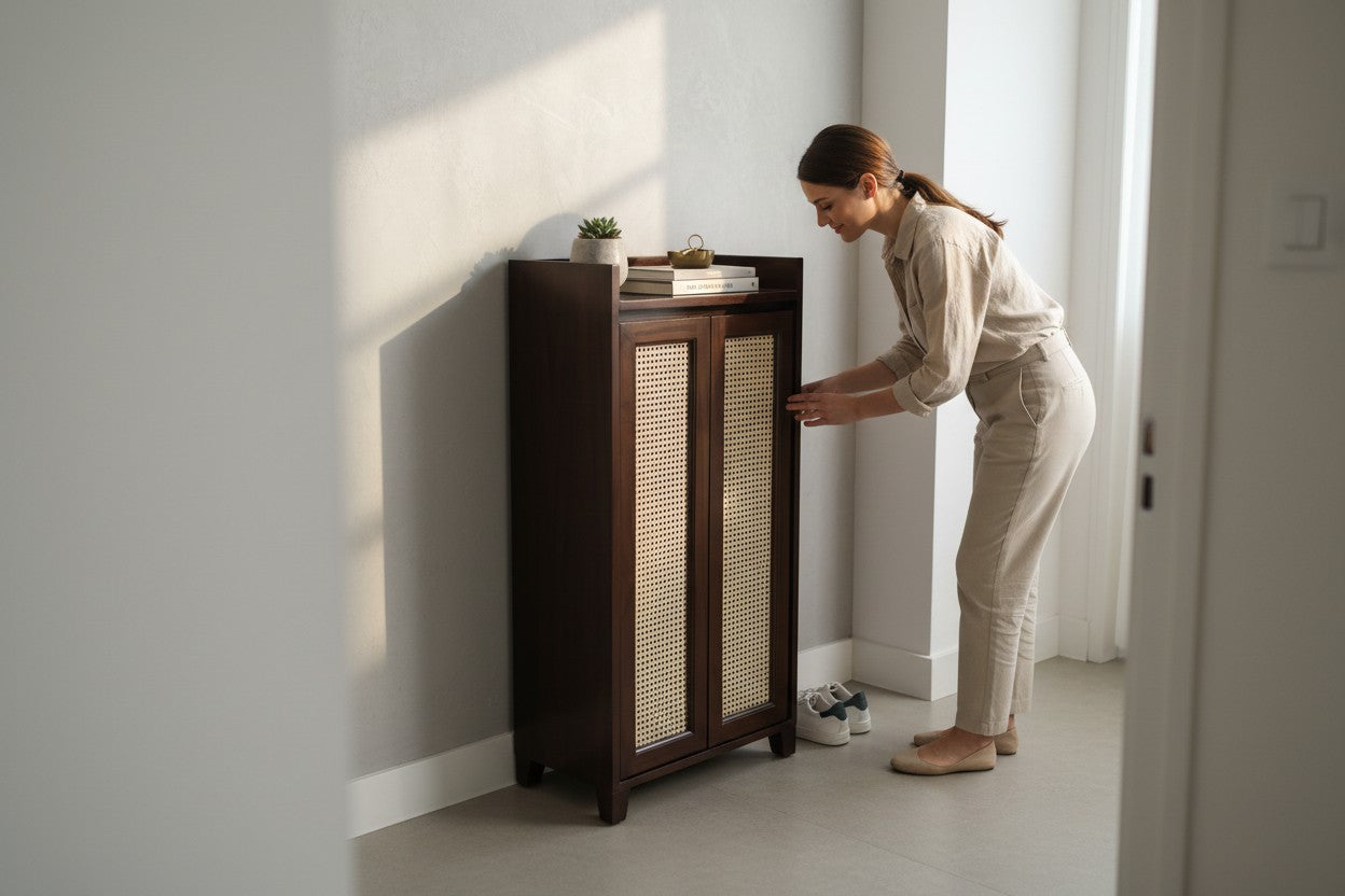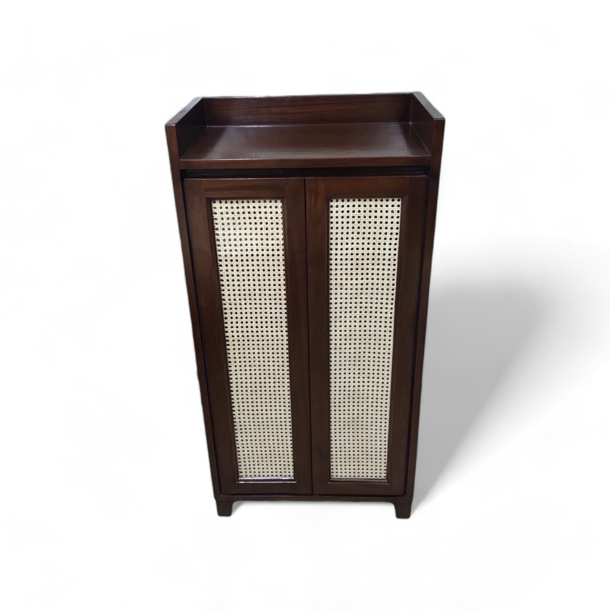 This premium storage cabinet, handcrafted from solid teak wood, features an elegant walnut finish and breathable natural rattan cane weaving. Its unique tray-top design and vertical silhouette make it a versatile addition to any space, functioning perfectly as a sophisticated shoe rack, bar cabinet, or hallway organizer with a modern-bohemian aesthetic.