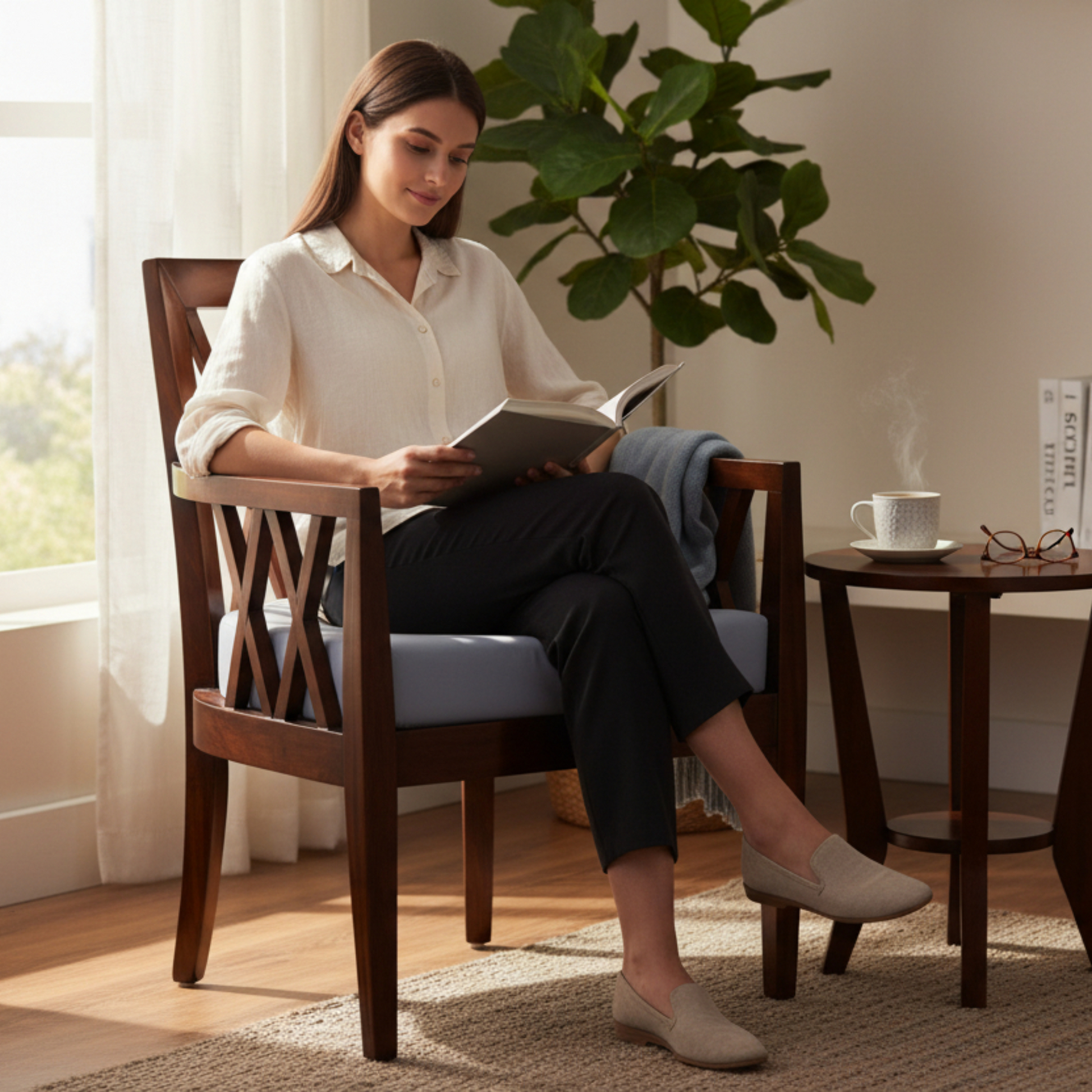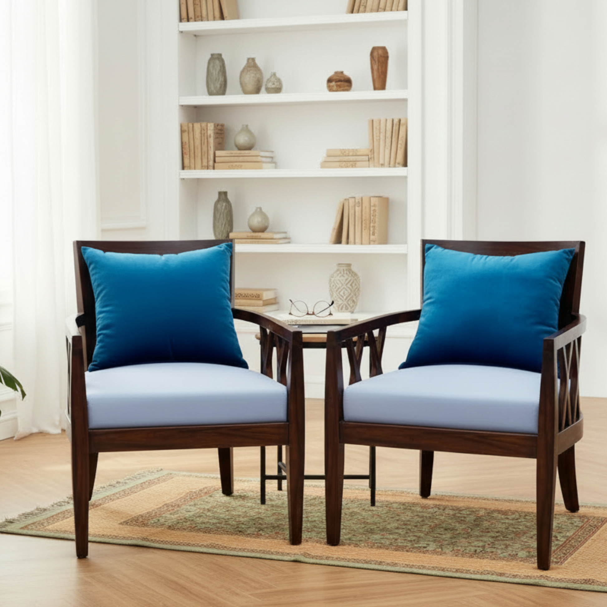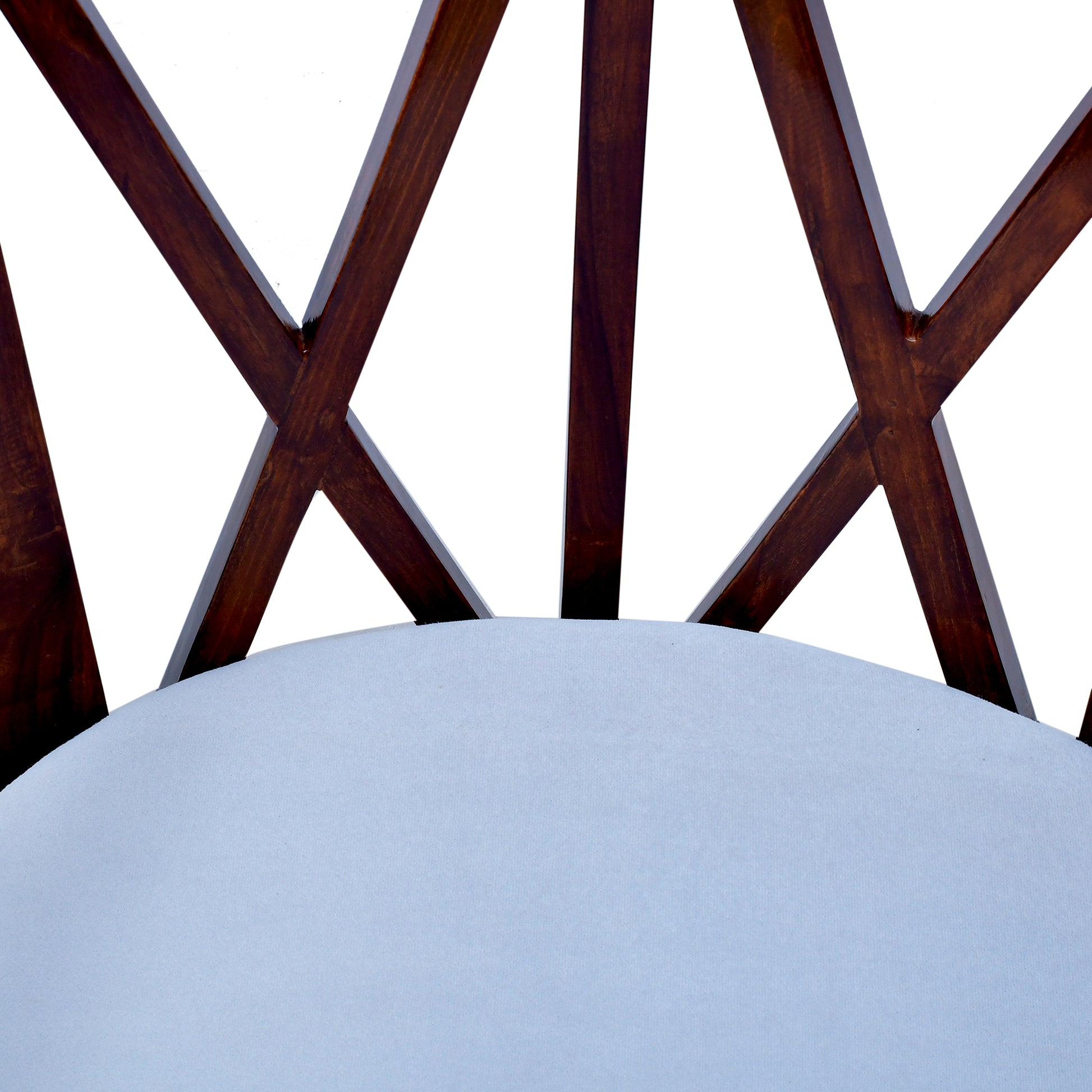 X-pattern geometric detailing, it balances classic charm with modern structure. The plush, pale blue upholstered seat provides a soft, cooling contrast to the dark, polished wood finish.