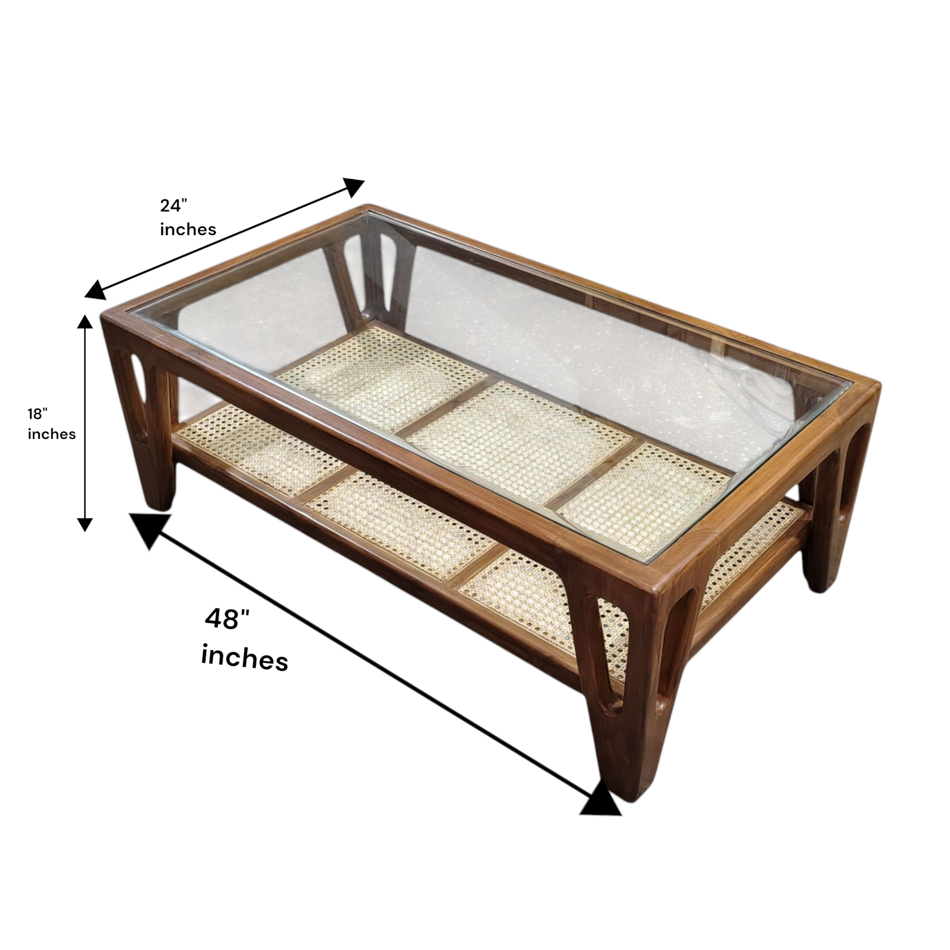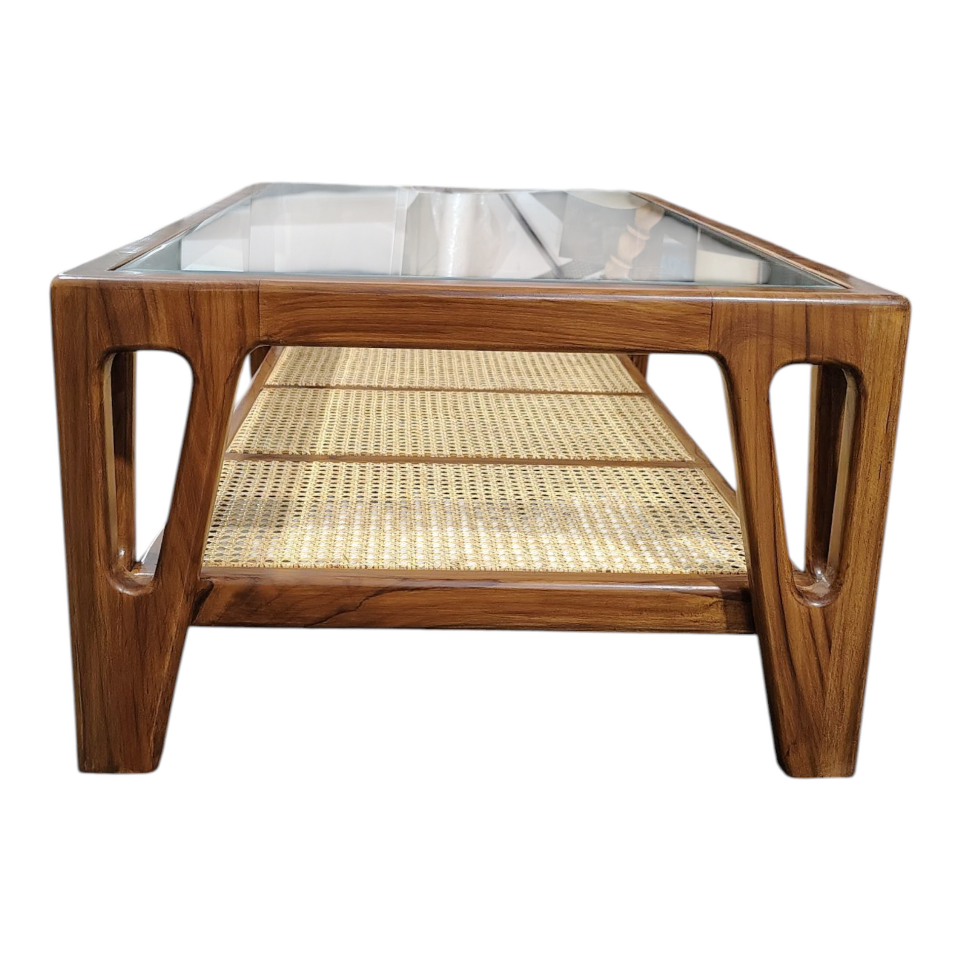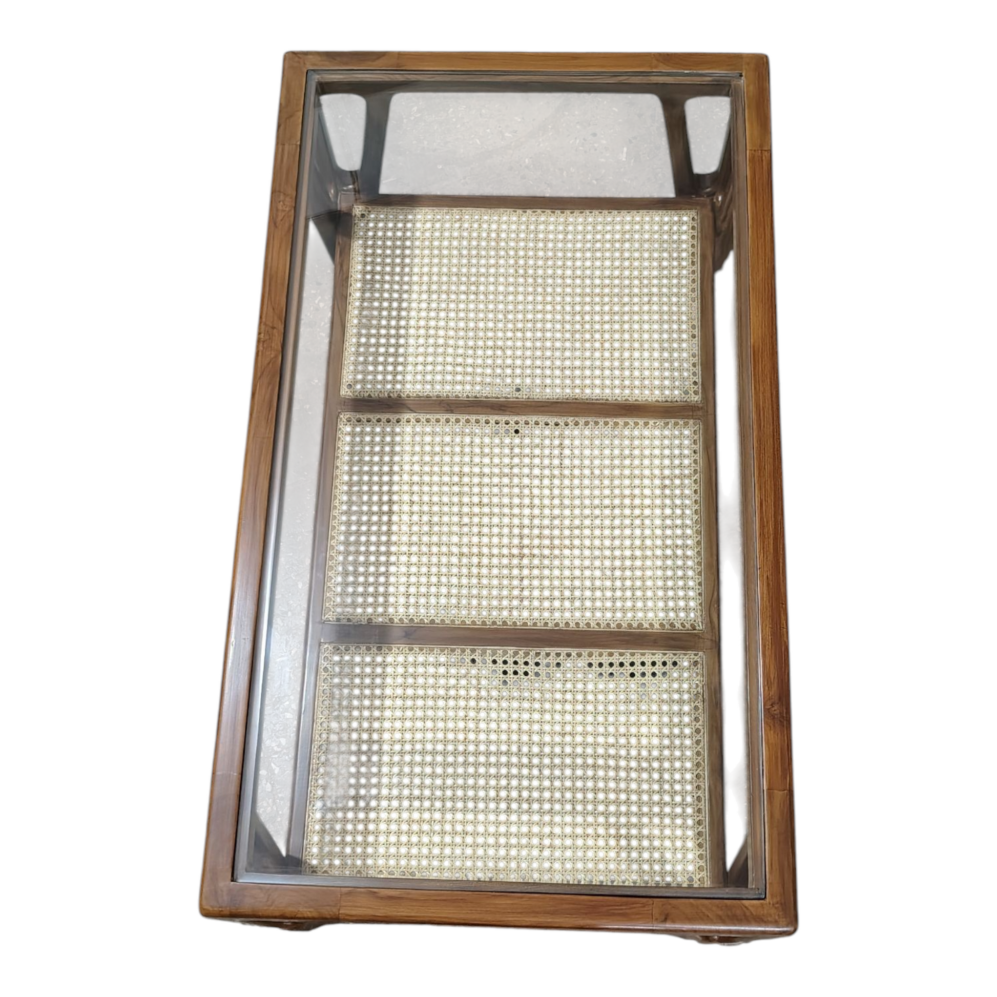 - Textured Cane Storage Detailing – Lower level features neatly divided rectangular sections filled with natural woven cane for added texture and visual depth.